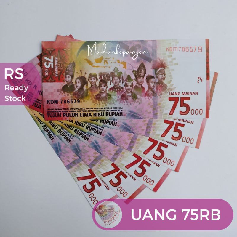 Ini uang pecahan 75000 yang dikeluarkan bi hari ini. Uang baru itu berupa pecahan rp 75.000. 75.000 bisa nyanyi lagu indonesia raya. Uang pecahan 75.000 yang baru diluncurkan bi dijual pedagang di aplikasi online. Kalau nukar ke bank kan antre, ke sini cepat.